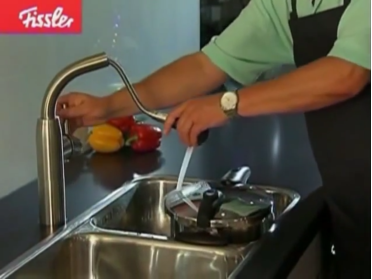 - Xả áp bằng nước mát: bạn đặt nồi áp suất Fissler Vitavit Comfort 6L dưới vòi nước mát, nước sẽ giúp nồi hạ nhiệt rất nhanh, kéo theo áp suất và nhiệt độ bên trong nồi sẽ giảm xuống. Tuy nhiên, bạn nên hạn chế sử dụng phương pháp này, vì như vậy bạn không chỉ hao phí năng lượng và nhiên liệu, mà còn làm giảm tuổi thọ các chi tiết nhựa hay gioăng nồi áp suất... Và bạn cũng cần lưu ý là không xả nước trực tiếp vào các lỗ thông hơi hay van điều chỉnh của nồi vì nó có thể gây nghẹt van bạn nhé.