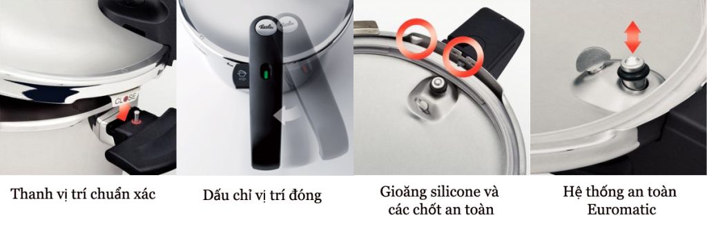- Hệ thống van an toàn Euromatic: khi nắp nồi đóng đúng cách, van Euromatic sẽ tự động đóng sau khi không khí bên trong nồi được đẩy hết ra ngoài, chỉ lúc này áp suất mới được hình thành bên trong nồi.